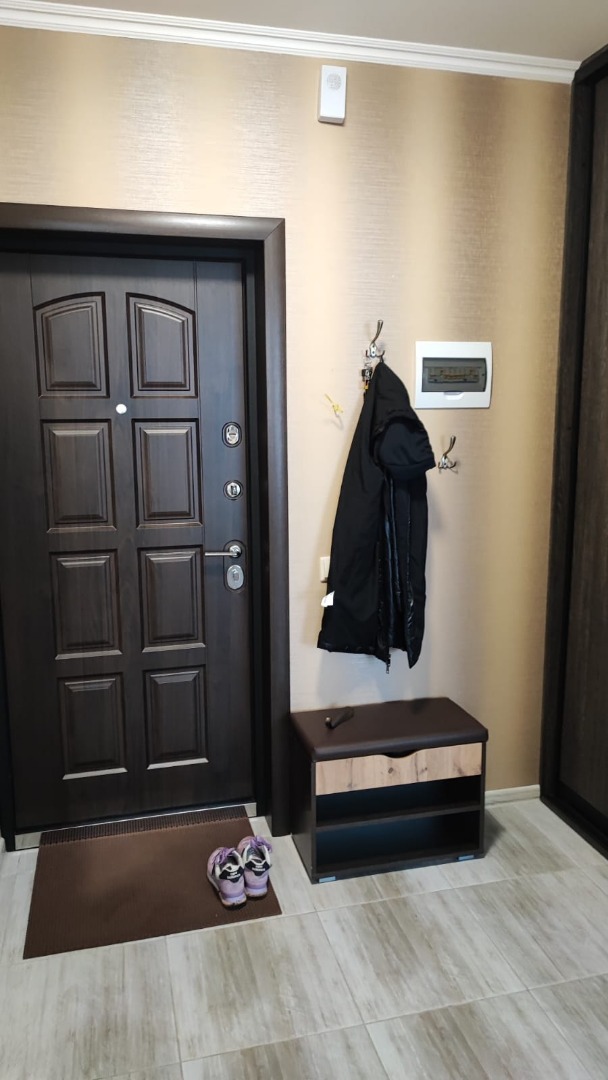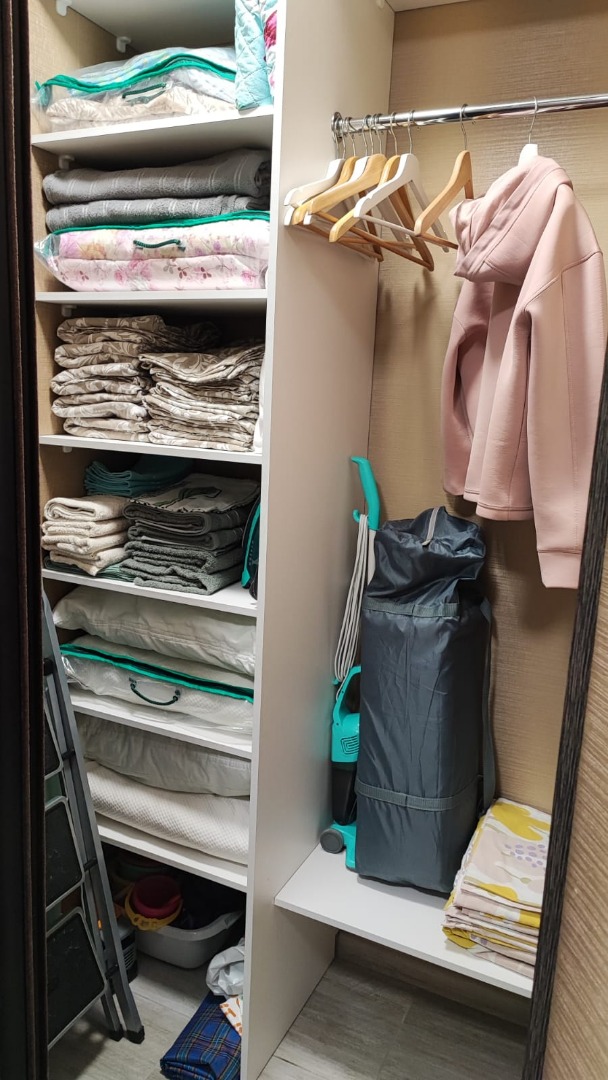 В коридоре встроенный шкаф. В шкафу сейф, утюг, гладильная доска, пылесос, детский манеж, комплекты хорошего постельного белья, полотенец, пледы, WiFi роутер.