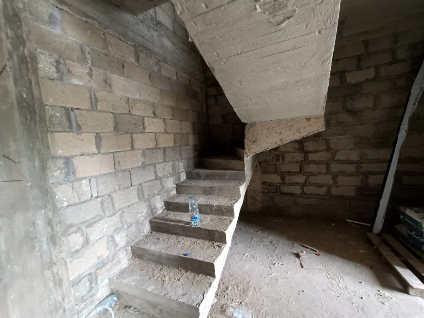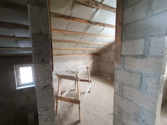 На первом этаже, кухня-гостинная и комната, на втором три комнаты и гардеробная.